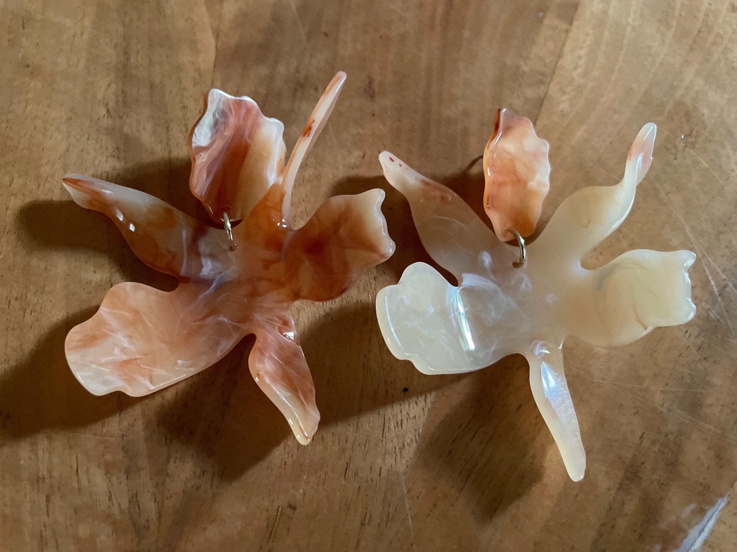 gorgeous resin floral art.beautiful sandy beach sunrise & seashell color palette. each pair is unique! this artisan started her own business from scratch after a life-changing event and now returns proceeds from her work back to women who “may need a little help to keep on dreaming”. these fabulous statement earrings will not weigh you down while wearing their statement extra-wide size! designed in texas. 3 x 2 inch dimensions.